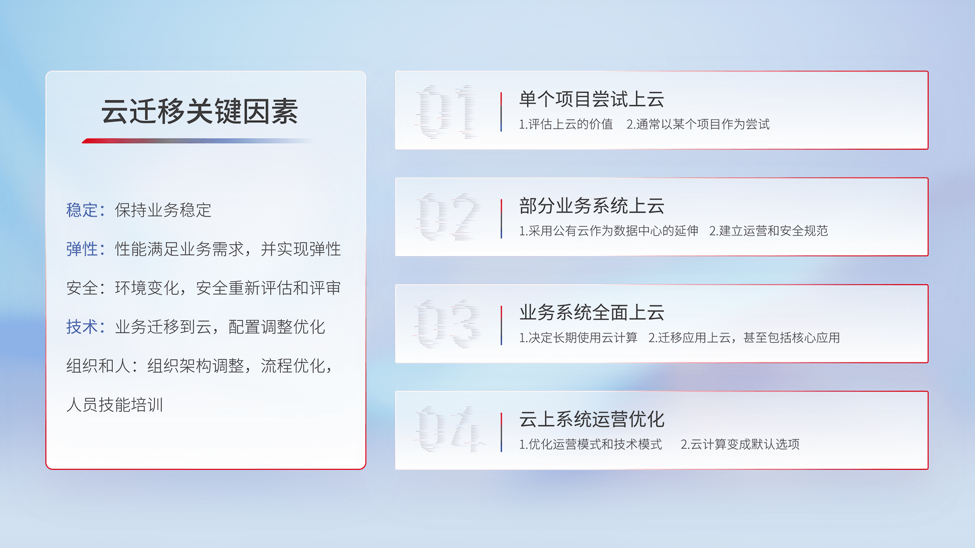 结合实际业务,,,从规划设计、、云平台选型、、、、云原生改造、、、、数据迁移、、、集成交付,,迁移全过程为客户识别最佳上云路径,,,做好风险识别管理,,,,设计网络架构、、、身份权限、、安全审计合规、、、、操作审计、、、日志审计、、、监控告警策略、、、多站点容灾设计等,,,对云上基础设施进行整体规划,,,提升IT治理水平,,,以满足弹性、、高可用、、、高性能的需求。。。。