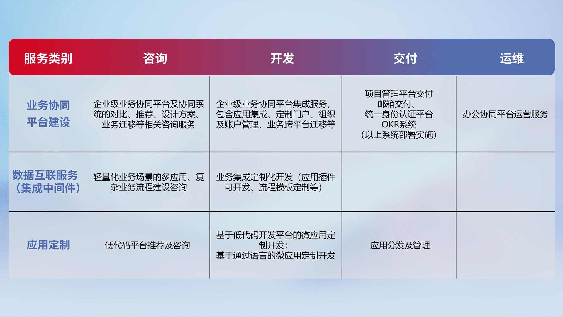 针对钉钉、、、企微、、、IDaas等平台级产品提供产品的规划、、、方案、、、交付、、、、定制化开发等服务,,,,实现如统一协同办公、、、、智能客户服务、、、混合会议管理、、智能数据查询、、、等业务场景,,,,实现数字化转型。。。。